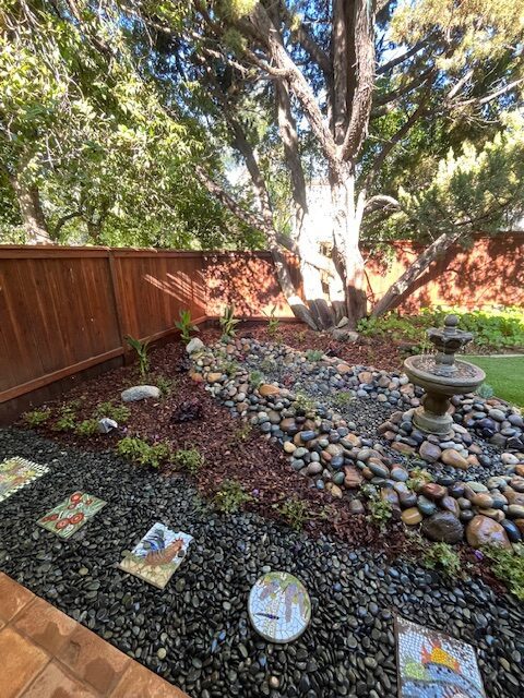 - Landscape Design and Installation of drought-tolerant plants; dry river bed; flagstone walkway and edging; lighting; irrigation; bark; boulders, river rock and gravel; and hand-painted Talavera clay pot with birds and butterflies.