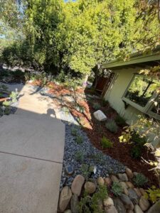 - Landscape Design and Installation of drought-tolerant plants; mini-swale with multiple sized river rocks, pebbles and boulders; flagstone front yard steps and backyard patio; irrigation and bark.