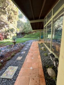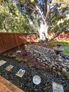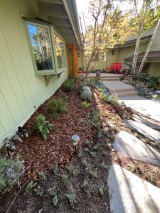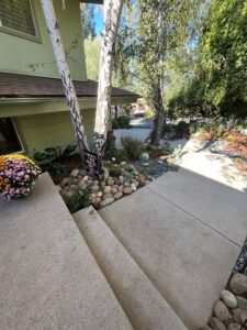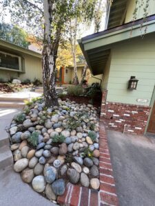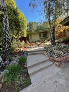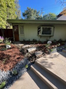 - Landscape Design and Installation of drought-tolerant plants; mini-swale with multiple sized river rocks, pebbles and boulders; flagstone front yard steps and backyard patio; irrigation and bark.