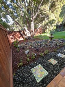 - Landscape Design and Installation of drought-tolerant plants; dry river bed; flagstone walkway and edging; lighting; irrigation; bark; boulders, river rock and gravel; and hand-painted Talavera clay pot with birds and butterflies.